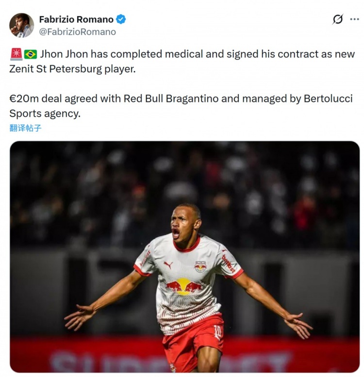 罗马诺透露,巴甘蒂诺红牛23岁中场乔纳坦已经完成体检,并与泽尼特签署合同,两家俱乐部就2000万欧的转会费达成协议。