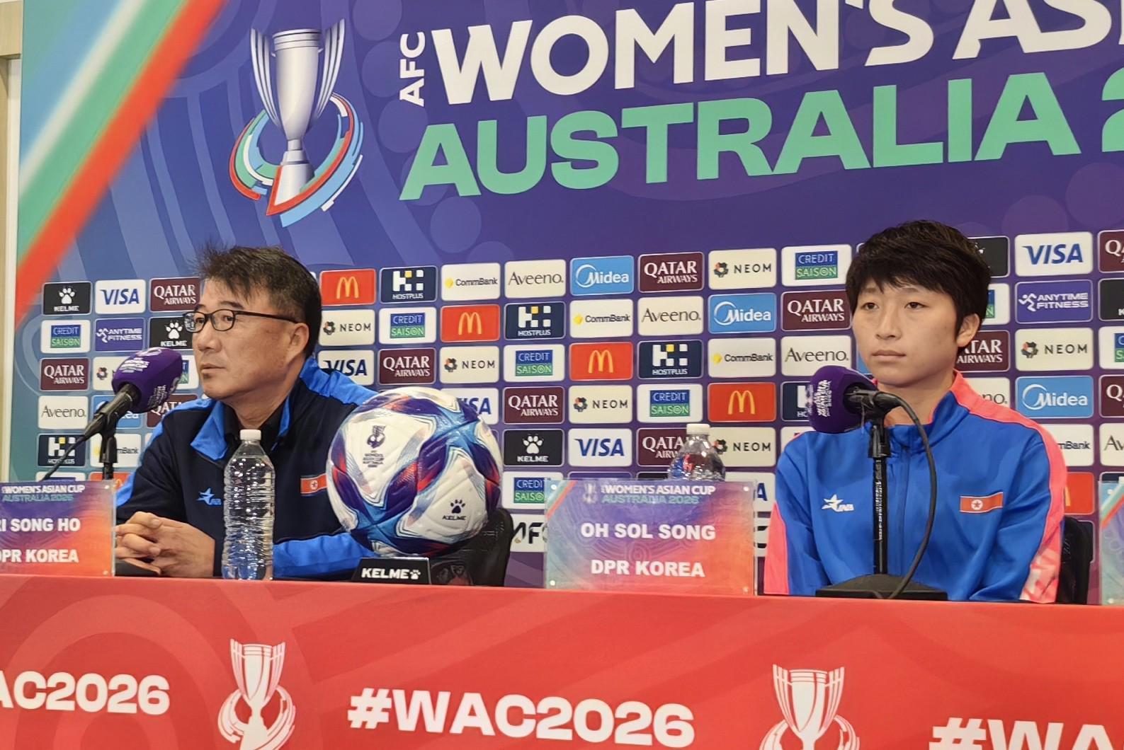 北京时间3月5日,女足亚洲杯小组赛孟加拉国vs朝鲜的赛前新闻发布会在西悉尼体育场进行。朝鲜队主教练李成镐携球员吴雪成出席。