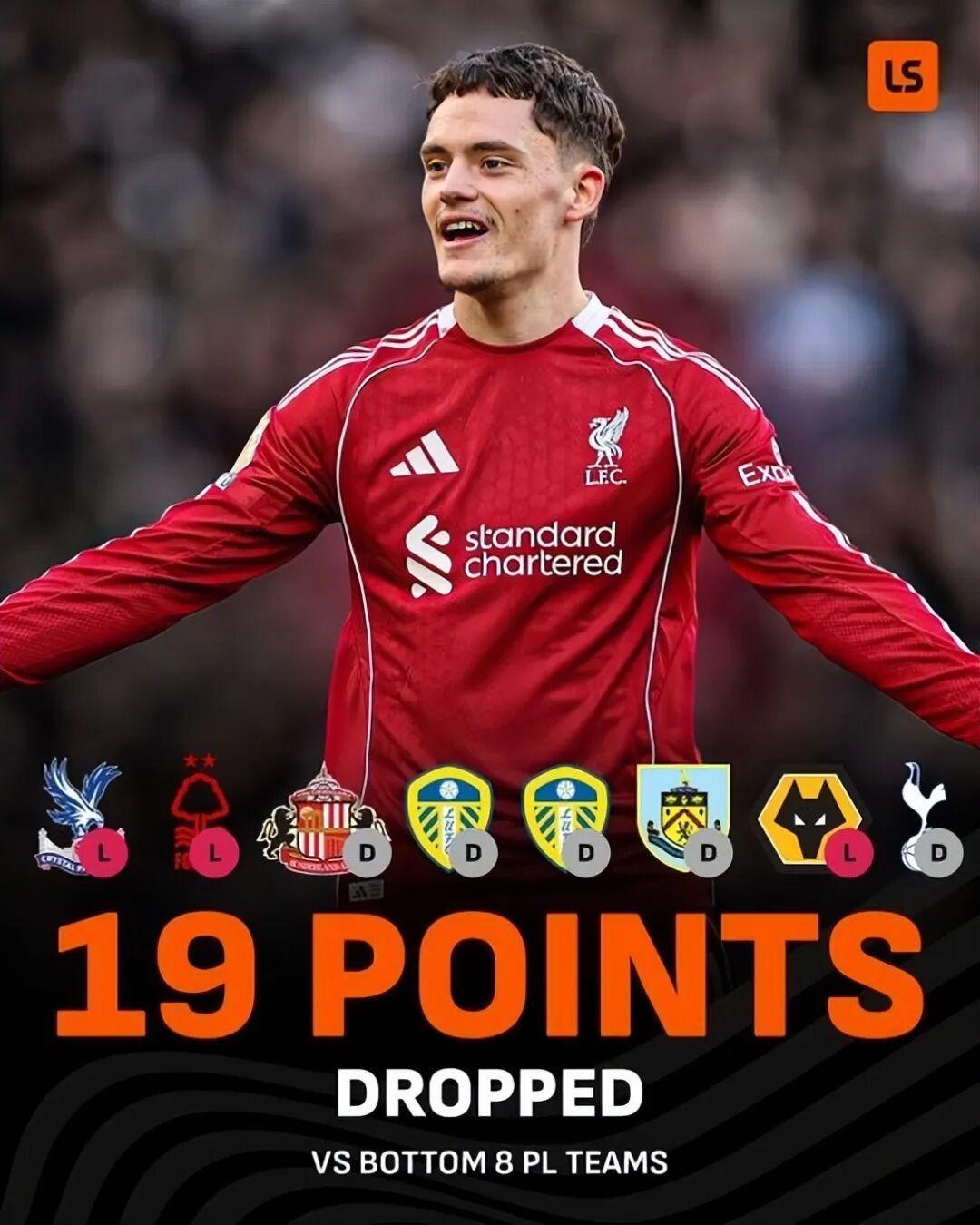 根据数据机构记录,本赛季利物浦对英超联赛后八名球队丢了19分。这个成绩跟他们昔日的斗志、不服输的比赛特色正好相反。据悉,斯洛特输给过水晶宫、诺丁汉森林和狼队,战平过桑德兰、利兹联(2次)、伯恩利和热刺的,的确是送分太多。